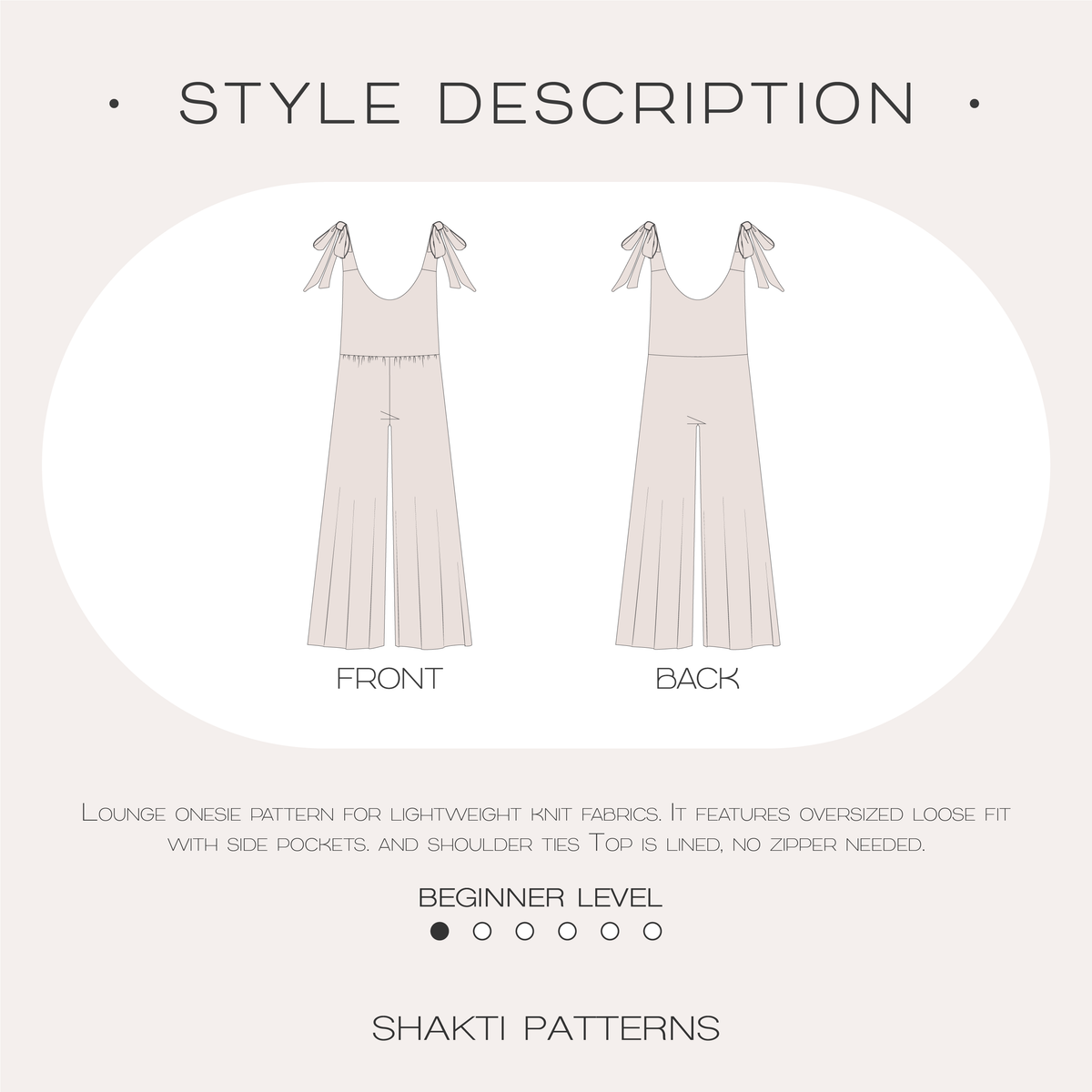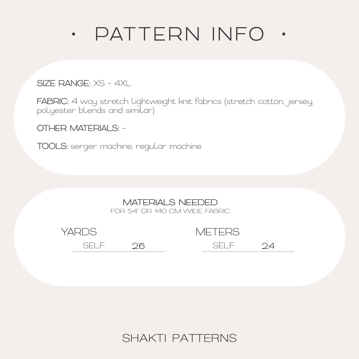 This sewing pattern is designed for lightweight knit fabrics, it features oversized look, side pockets and lined top with shoulder ties. Use same fabric for lining. No zipper needed.