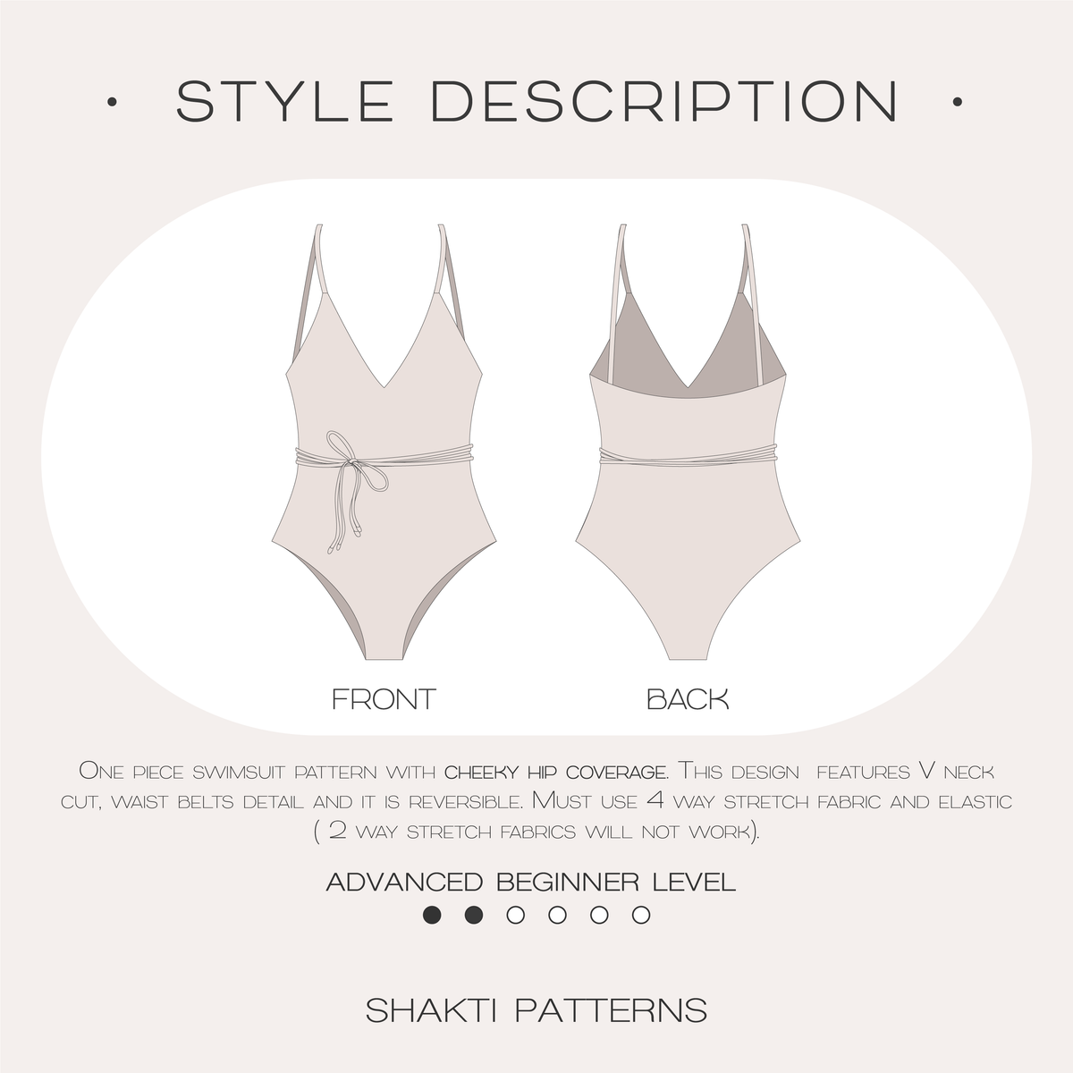 One piece swimsuit pattern, it features cheeky hip coverage and V shaped neckline and waist belt detail, swimsuit is reversible. Must use 4 way stretch fabrics, 2 way stretch fabric will not work, do not skip elastic (wet swimsuit is heavy, elastic will hold it in place).