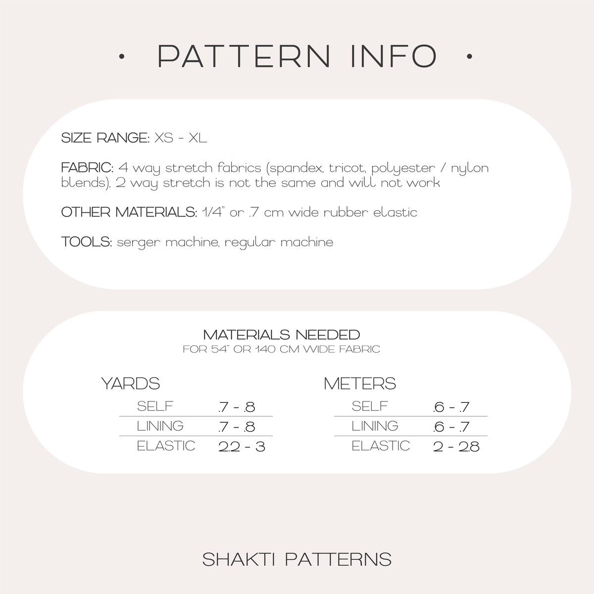- Fabric: 4 way stretch medium to lightweight materials such as spandex, tricot, polyester/nylon blends (lining fabric must have same stretch and weight)