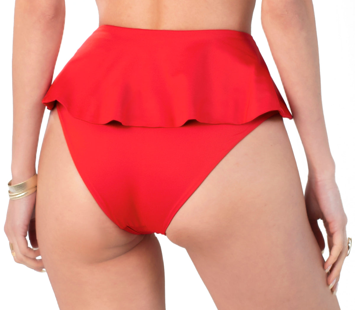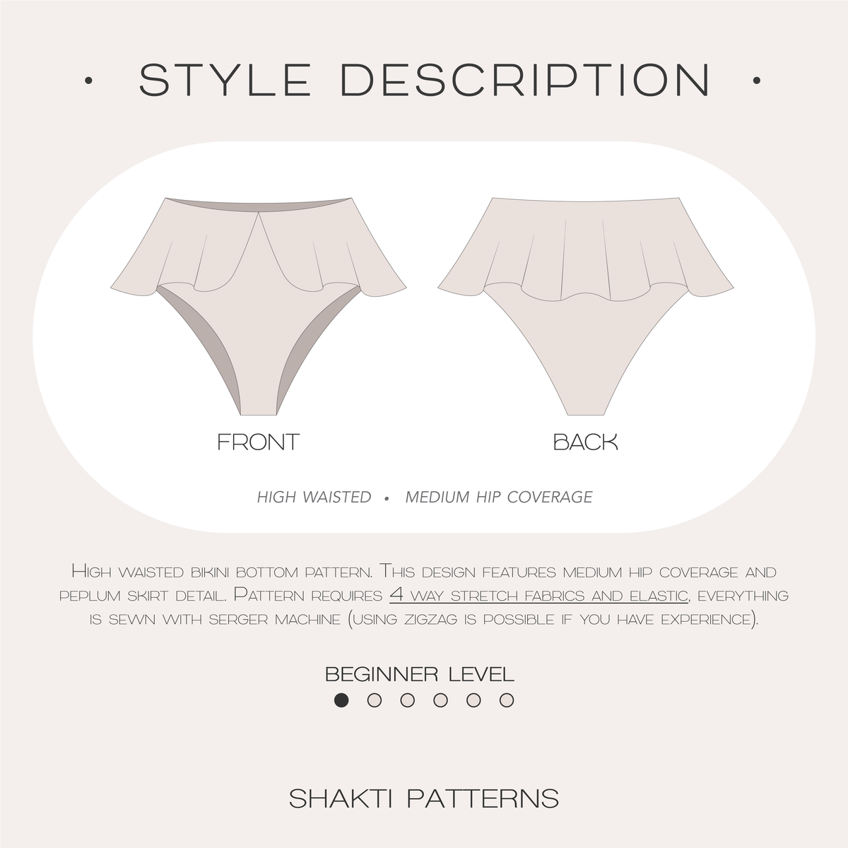 High waist bikini sewing pattern. It features high waist fit, medium hip coverage and peplum skirt detail. Pattern requires 4 way stretch fabrics and elastic.