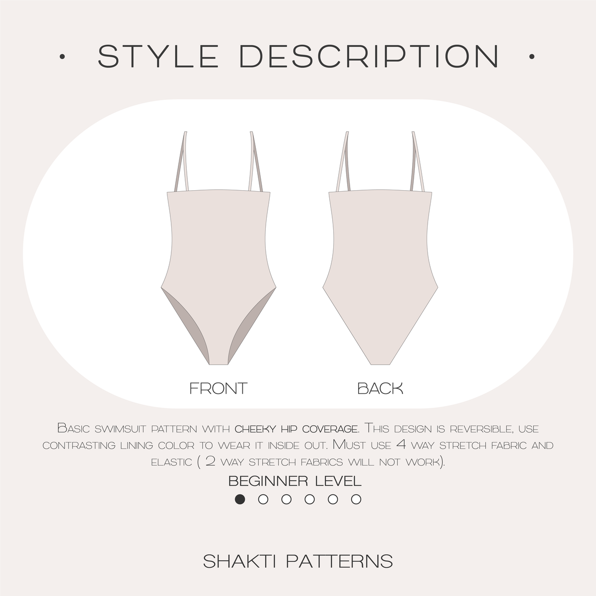 Simple swimsuit pattern for beginners, it features cheeky hip coverage and straight neckline, swimsuit is fully reversible. Must use 4 way stretch fabrics, 2 way stretch fabric will not work, do not skip elastic (wet swimsuit is heavy, elastic will hold it in place).