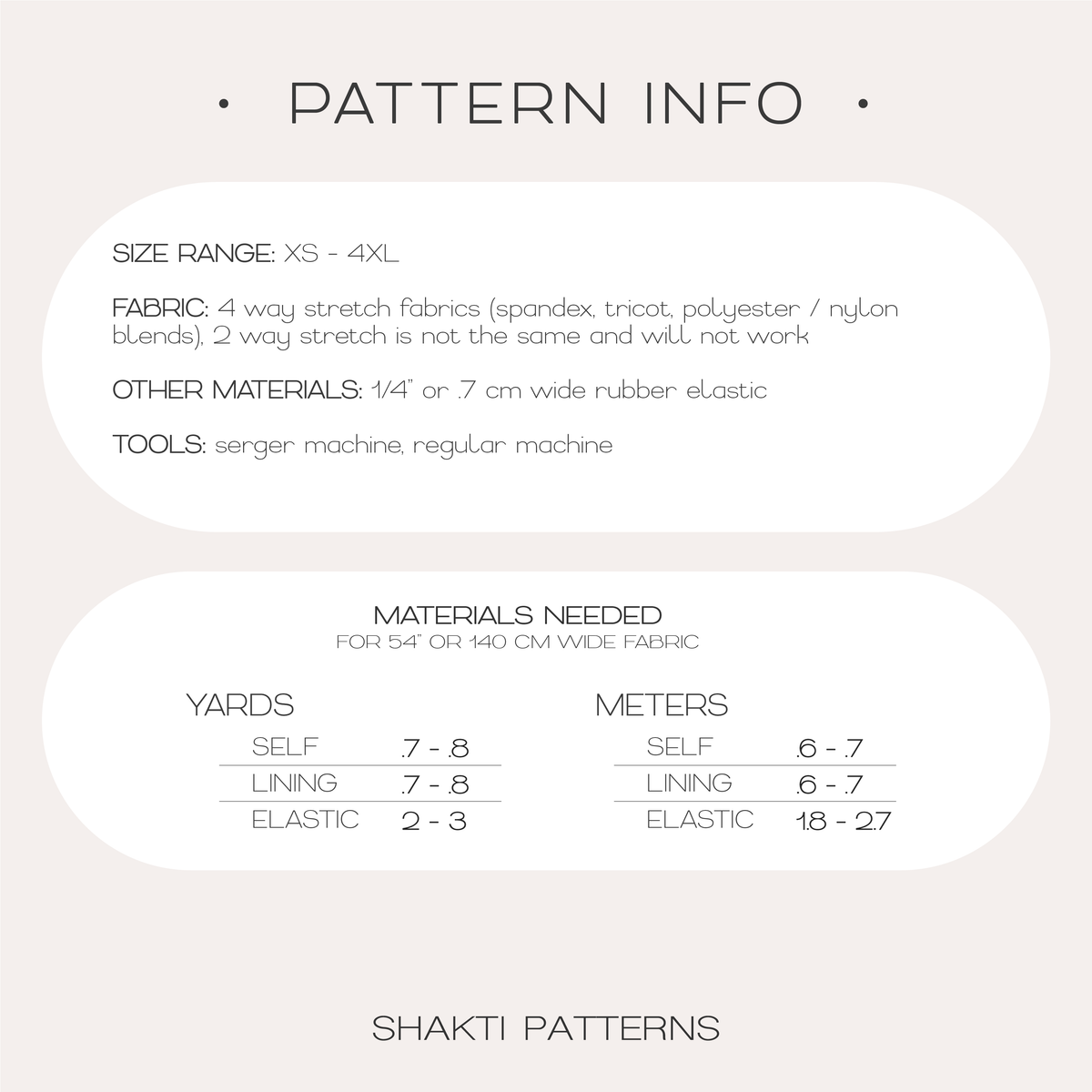 - Fabric: 4 way stretch medium to lightweight materials such as spandex, tricot, polyester/nylon blends (lining fabric must have same stretch and weight)