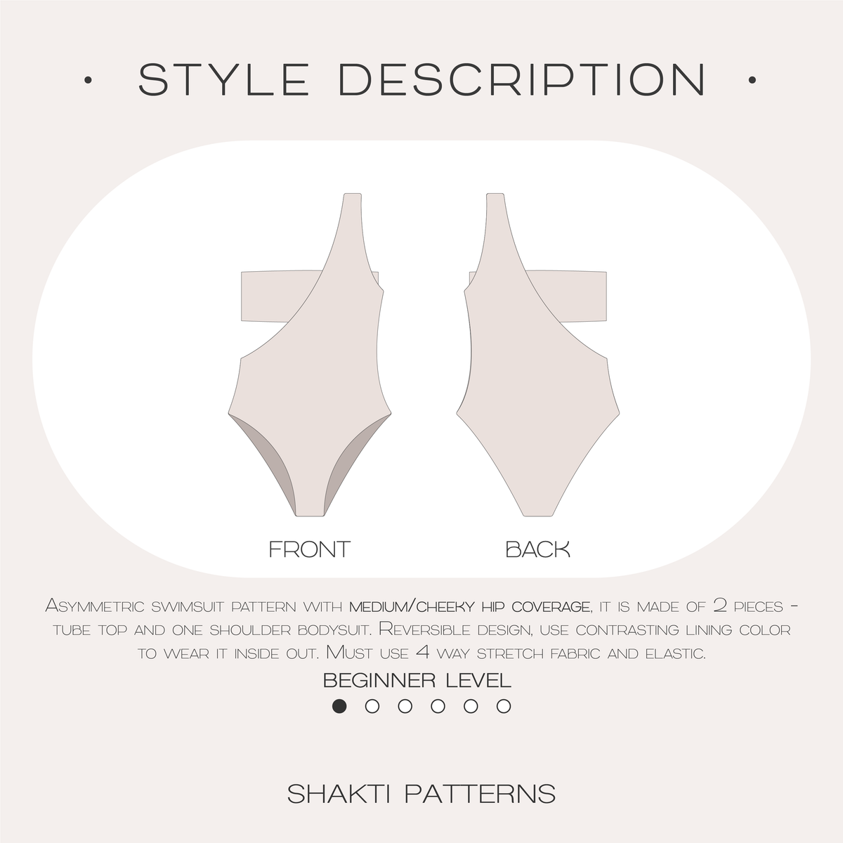 Asymmetric swimsuit pattern, it features medium/cheeky hip coverage, tube top and one shoulder bodysuit, swimsuit is fully reversible. Must use 4 way stretch fabrics, 2 way stretch fabric will not work, do not skip elastic (wet swimsuit is heavy, elastic will hold it in place).