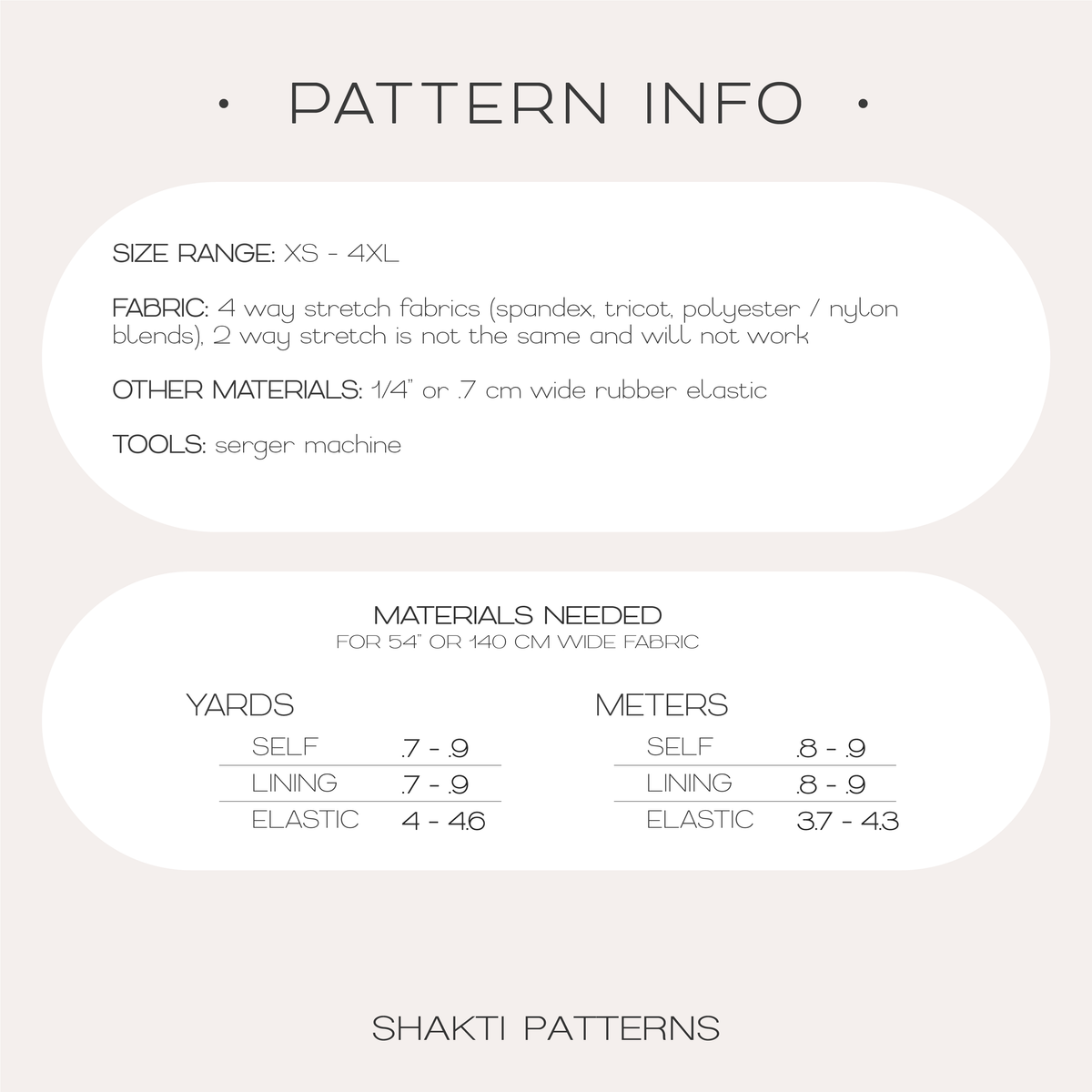 - Fabric: 4 way stretch medium to lightweight materials such as spandex, tricot, polyester/nylon blends (lining fabric must have same stretch and weight)