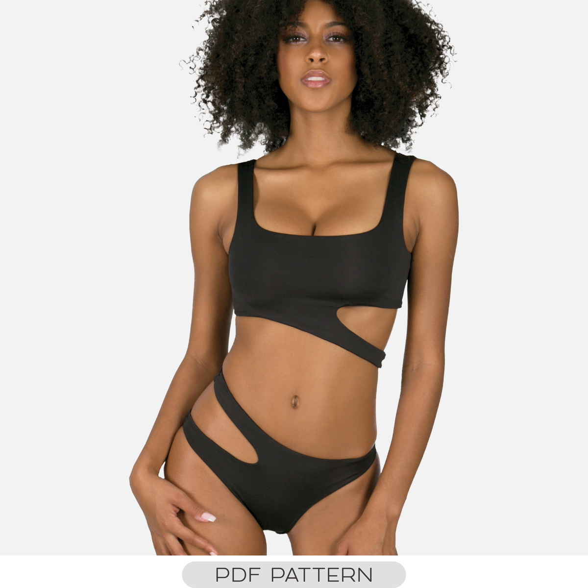 Asymmetric bikini set sewing pattern. Both pieces of this set are reversible and can be worn inside out. Bottom low rise fit and medium hip coverage. This project requires 4 way stretch fabric (2 way stretch will not work), elastic and serger machine.