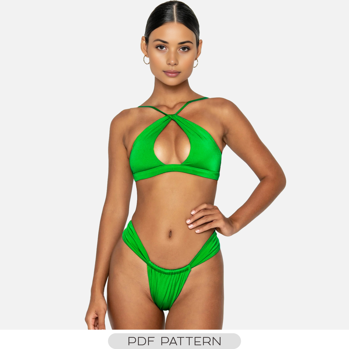 Elegant bikini set sewing pattern. Bottom piece is reversible and can be worn inside out, it has low rise fit and cheeky hip coverage. Top has cutout front detail and is rather open, This project requires 4 way stretch fabric (2 way stretch will not work), elastic and serger machine.