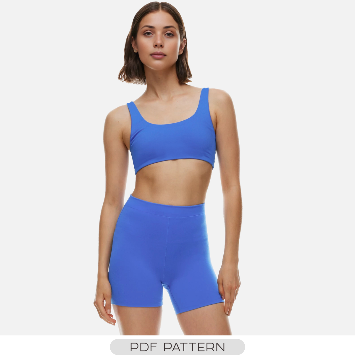 Fitness set sewing pattern. This bundle features biker shorts with elastic waistband and reversible crop top with scoop neckline. Project requires 4 way stretch fabric (2 way stretch will not work), elastic and serger machine.