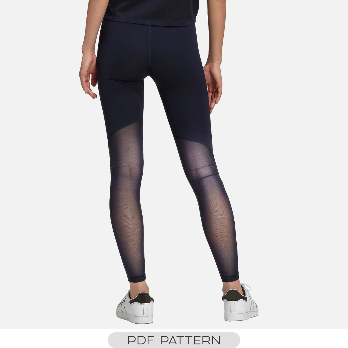 Women's leggings pattern. This design features high waist, elastic waistband and color blocking design in the back. To get best results you must use 4 way stretch fabric (non stretch will not work).