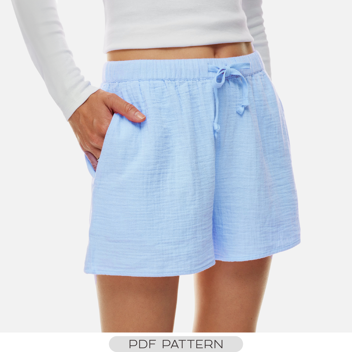Shorts pattern for women. This design has mid rise fit, side pockets, elastic waistband with drawstring detail and wide leg cut. Great pattern to make casual everyday short or lounge/pajama bottoms. To get best results you use non stretch medium to lightweight woven fabric.