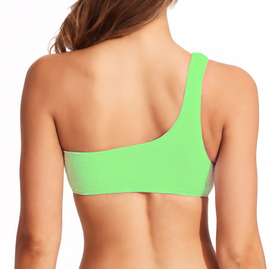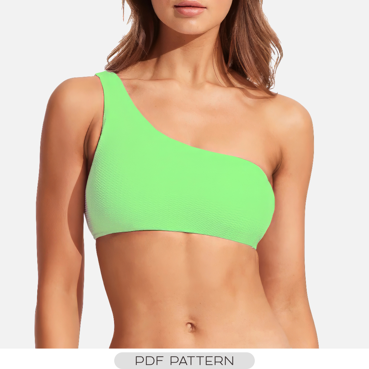 Bikini top sewing pattern. This design features one shoulder design and it is fully reversible. To get best results use 4 way stretch fabric and do not skip elastic!