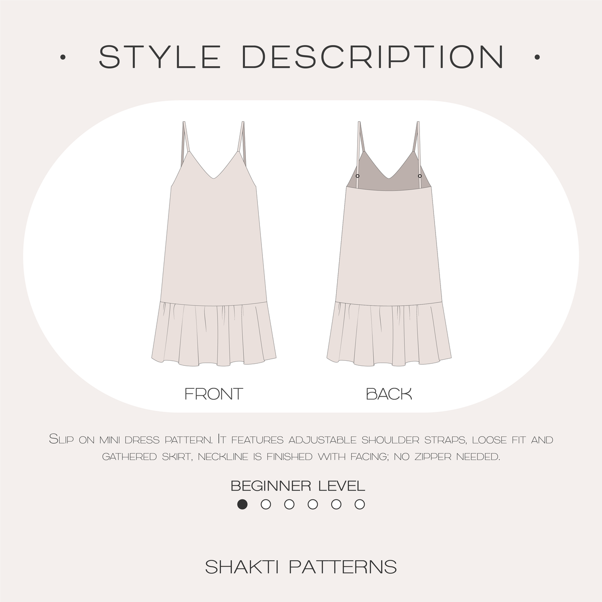 This sewing pattern is designed for lightweight woven fabrics, it features gathered skirt and relaxed/loose fit. Shoulder straps are adjustable; neckline is finished with facing.