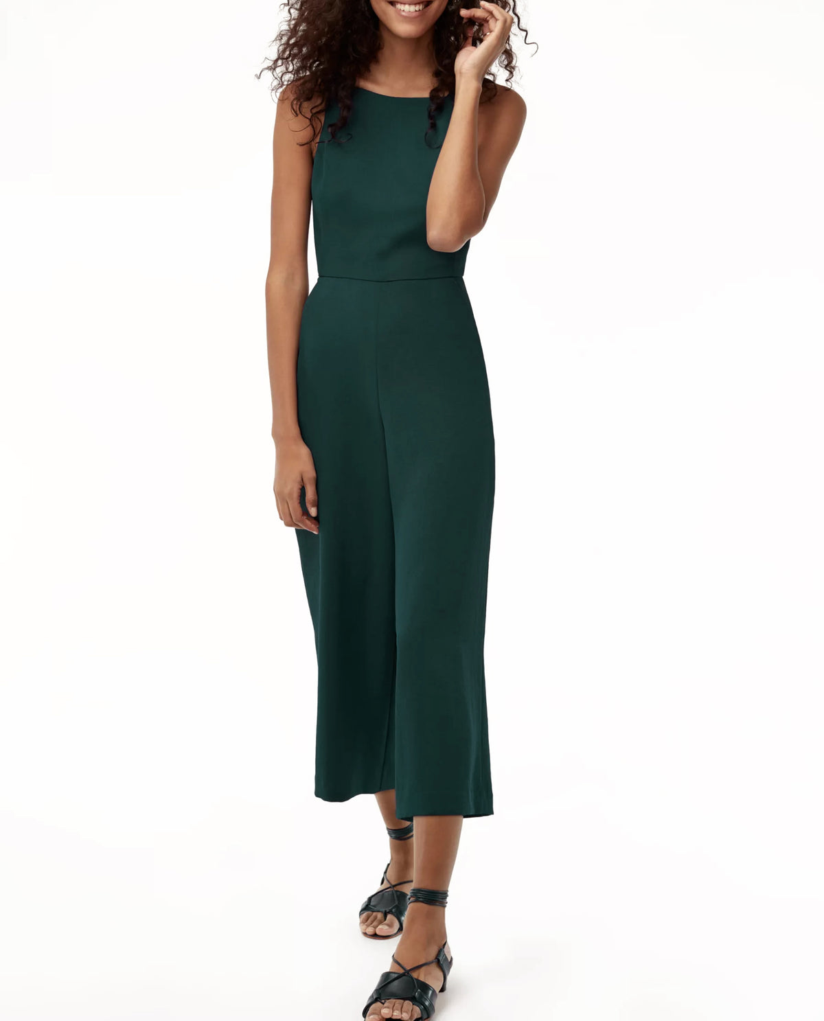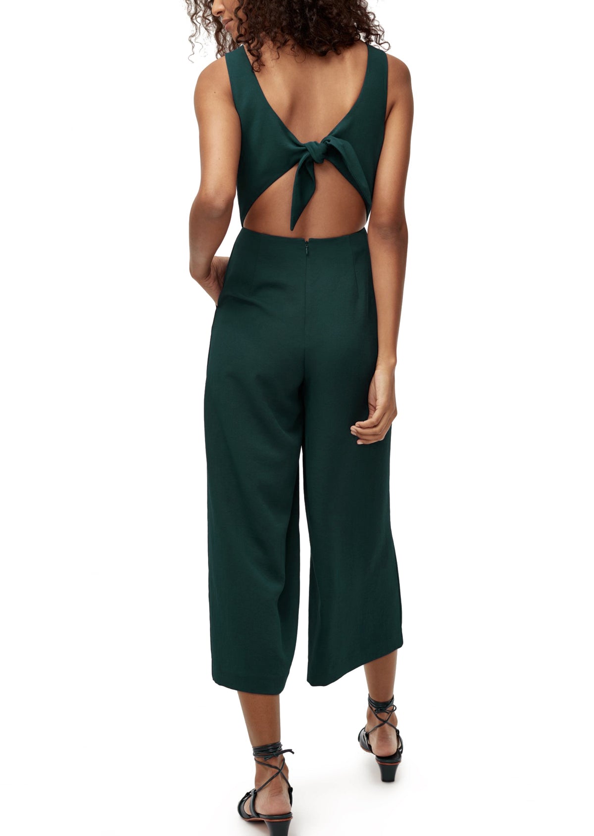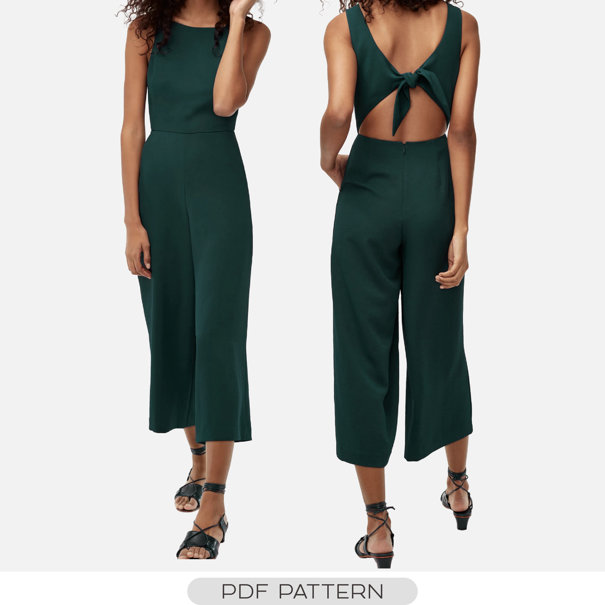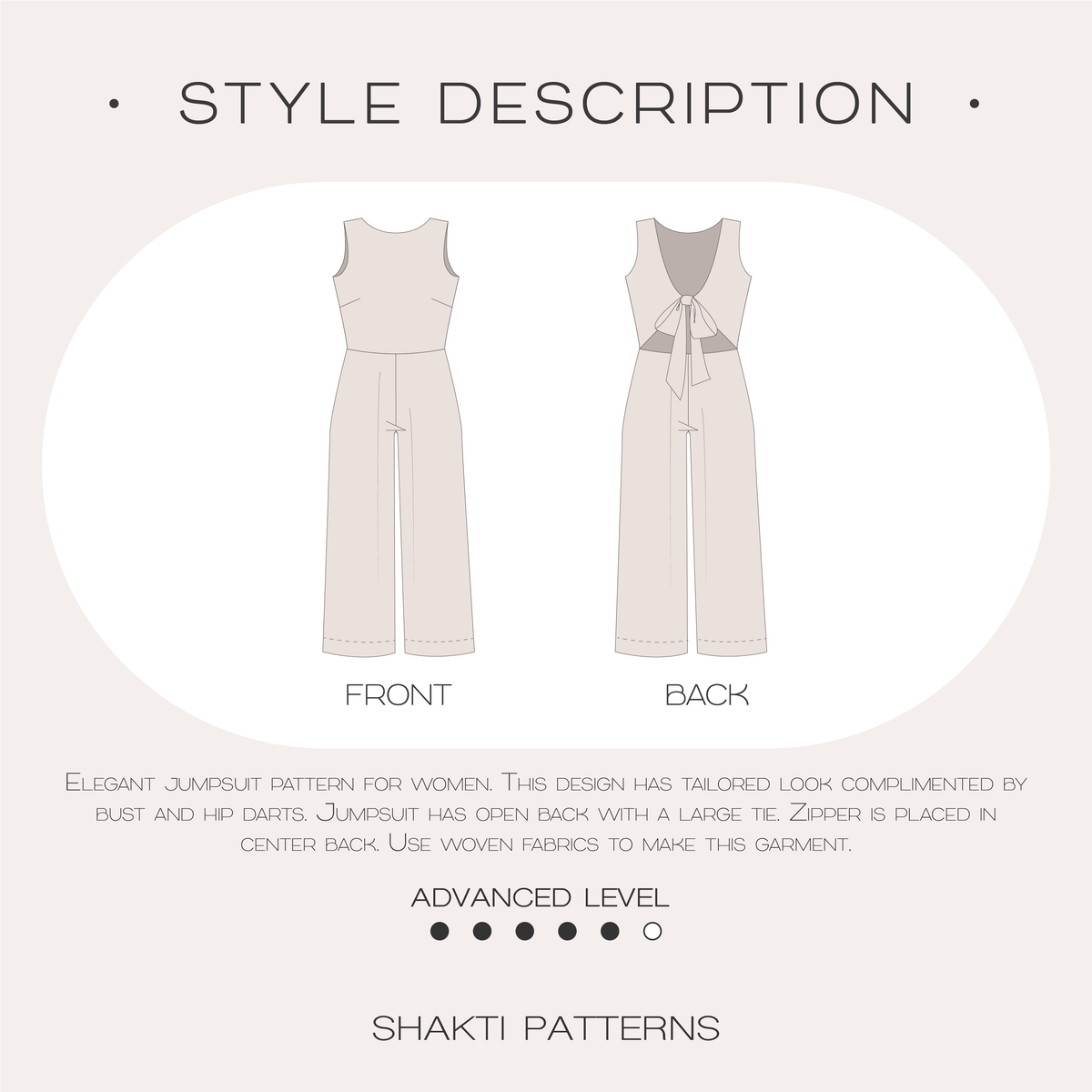 Elegant jumpsuit pattern for women. It is designed for lightweight woven fabrics, it is fitted well with functional bust and hip darts, invisible zipper is placed in center back. This design features open back with large tie. Experience is required.