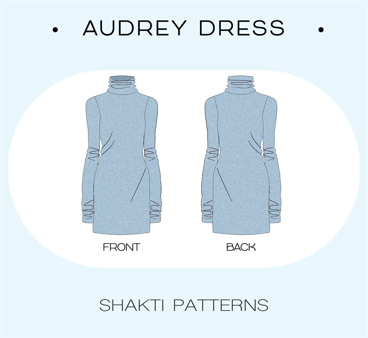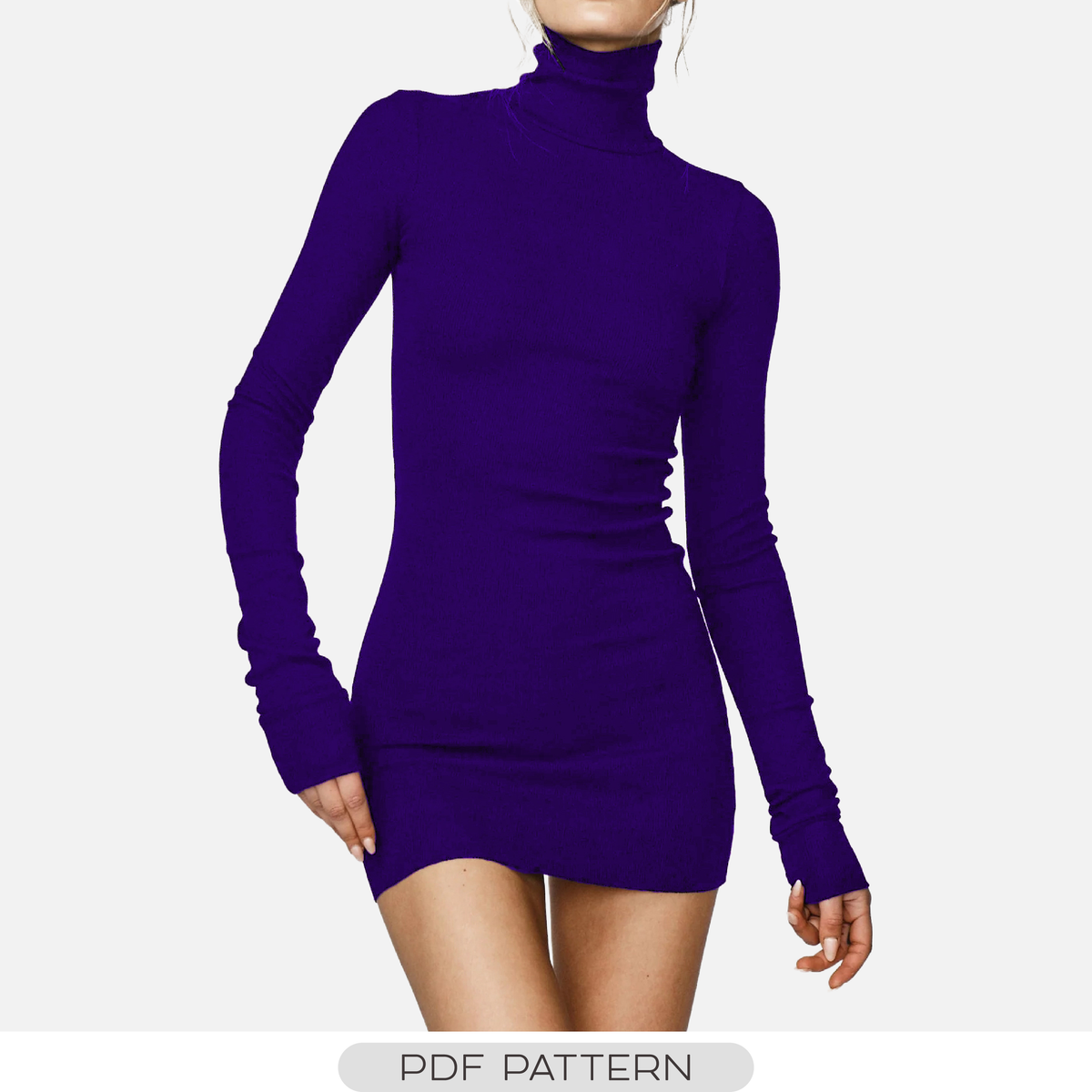 Turtleneck dress pattern, it is designed for medium weight 4 way stretch knit fabrics (2 way stretch will not work). Dress features fitted bodycon silhouette, long sleeves, mock neck design and short length. No zipper is needed to make this dress.