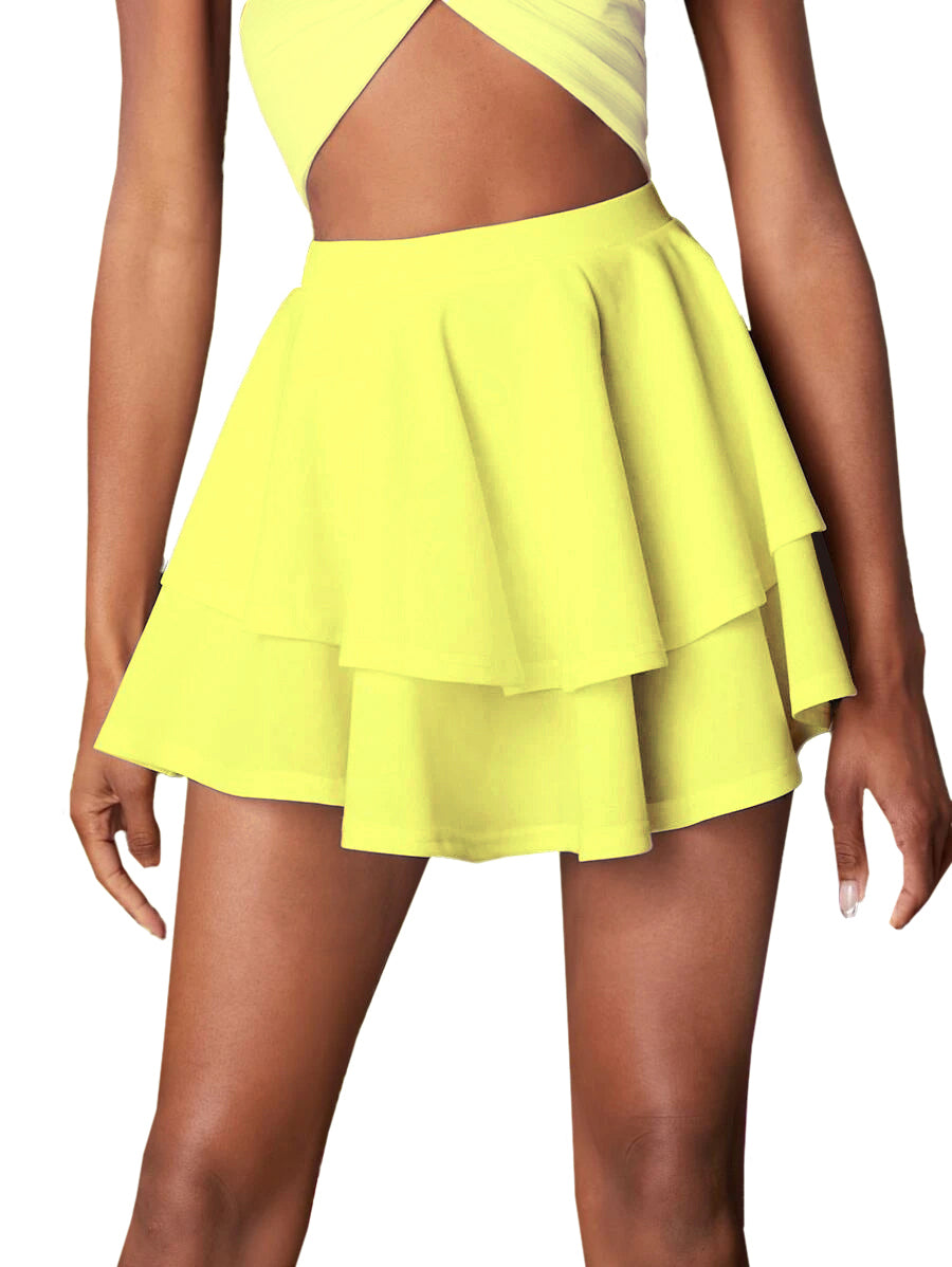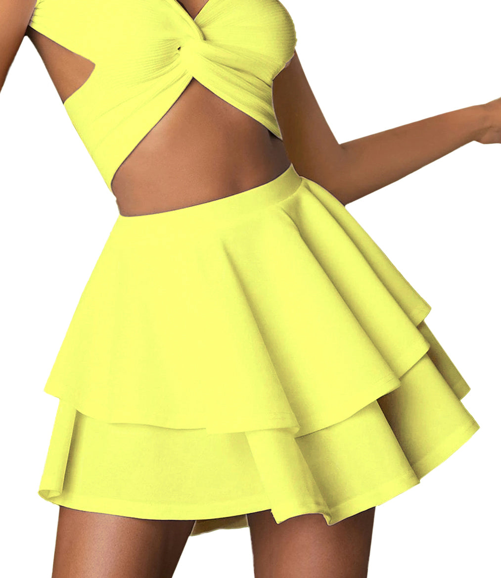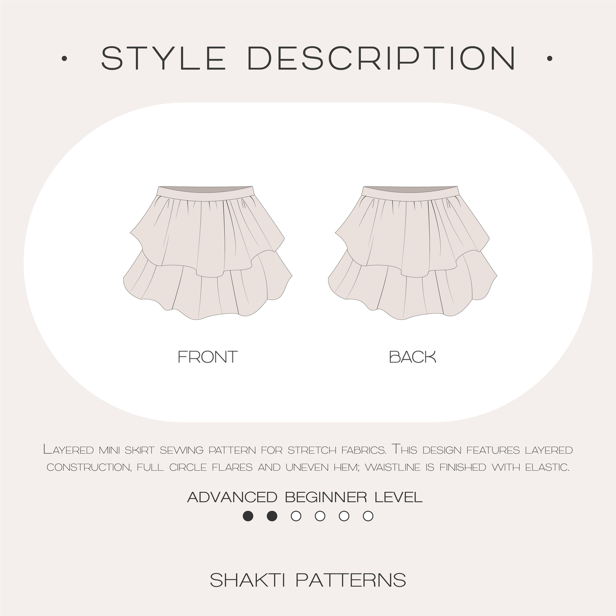 Layered mini skirt pattern is designed for lightweight 4 way stretch knit fabrics, it features full flares, uneven hem and elastic waistband. No zipper needed.