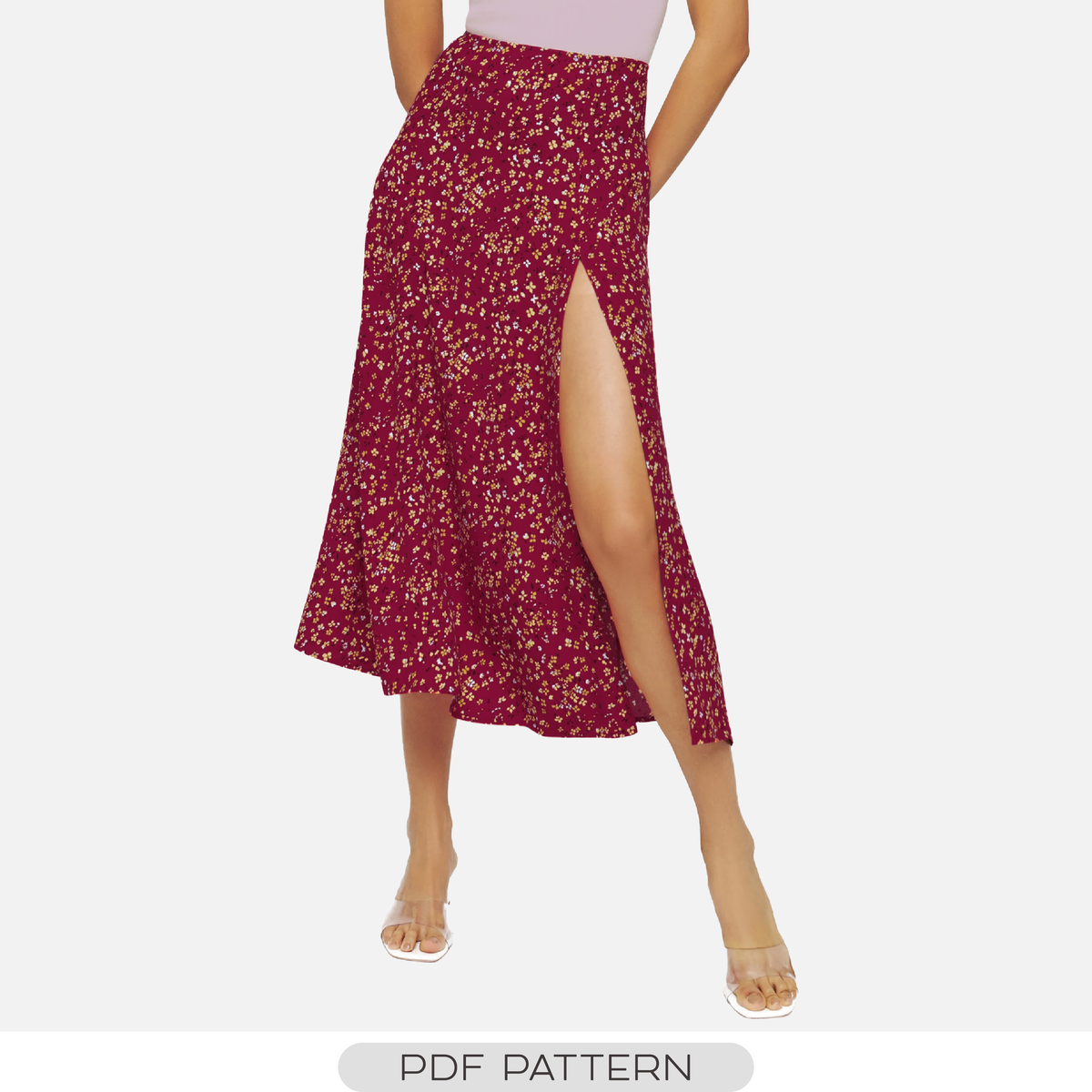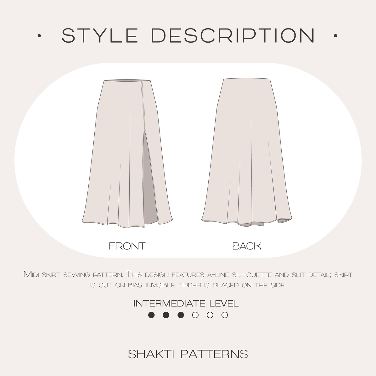 Slit midi skirt pattern is designed for lightweight silky fabrics, it features a-line silhouette and side slit detail. Skirt is cut on bias, working with silky fabrics requires experience. Invisible zipper is placed on the side.