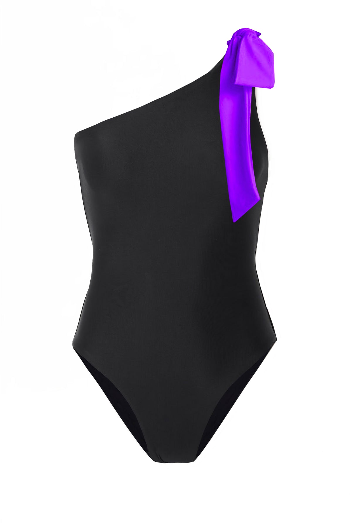 One shoulder swimsuit pattern for beginners. This style features asymmetric design with accent shoulder tie, it has medium hip coverage. Swimsuit is fully reversible. Must use 4 way stretch fabrics, 2 way stretch fabric will not work, do not skip elastic (wet swimsuit is heavy, elastic will hold it in place).