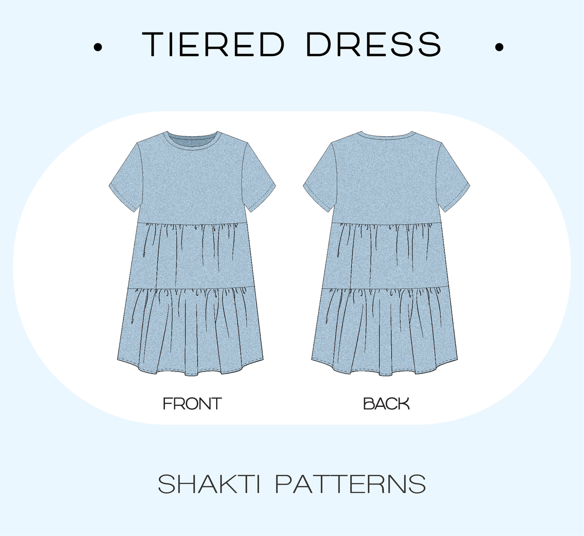 Basic dress t-shirt style with gathered tiered skirt, great sewing pattern for beginners. Digital patterns are delivered instantly after a purchase.